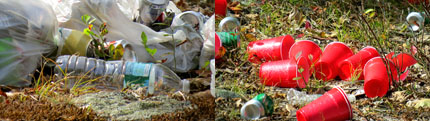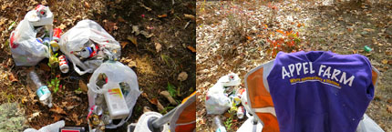 That UW wooded access road along Post Road is sometimes used illegally by all-terrain vehicles to enter and roam Liberty Rock Park. The remnants of the recent Litter Party included chairs, a table, beer cans and bottles, plastic water bottles and cups, and even a plastic gas can that still had gas in it.