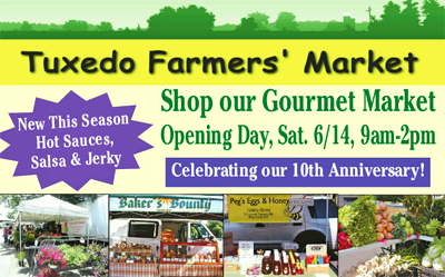TFMflyerpromoThe Tuxedo Farmers’ Market will celebrate 10 years at the Tuxedo Train Station with new vendors and fresh signage, Dave Dowling, and a special noon ribbon cutting to celebrate one of Tuxedo’s summer long Saturday attractions.